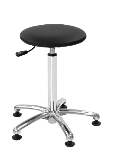 Asiento redondo y plano con control neumático de altura. Diámetro de la base 500 mm, acabado cromado, equipado con 5 ruedas. Amplia selección de colores de tapicería disponibles sin recargo.