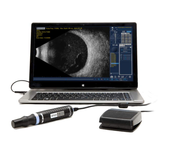 El software patentado de B-Scan Plus y B-Scan Plus Vet, combinado con una electrónica de sonda única, lo convierten en el único B-Scan portátil de alta definición. Durante el desarrollo del software B-Scan Plus, Accutome visitó muchas de las principales instalaciones de todo el mundo. Los resultados son una unidad fiable y fácil de usar, que puede escanear rápidamente a los pacientes y transportar información. Accesorios incluidos: Instalación de software, memoria USB, soporte de sonda, interruptor de pie, mouse inalámbrico y gel oftálmico.