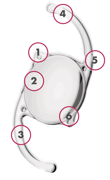 3 • Hápticos en ángulo de 10°:Mueve el implante hacia atrás, proporcionando una distancia segura del iris.